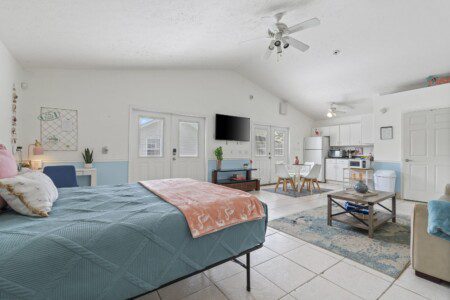 It has a sizeable master bedroom with a king bed, its own Smart TV, a large walk-in closet, and an ensuite master bathroom. There is another bedroom with a queen bed, and a bedroom with a twin bed AND twin over twin bunk bed for the kids, along with kids’ games and toys. We also provide a high chair and pack-and-play crib to make the place extra family-friendly.
